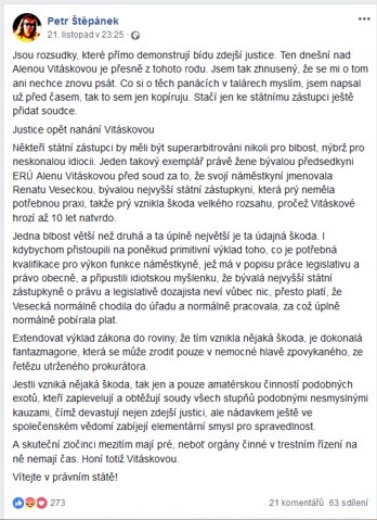 "Jsou rozsudky, které přímo demonstrují bídu zdejší justice. Ten nad Alenou Vitáskovou je přesně z tohoto rodu. Jsem tak zhnusený, že se mi o tom ani nechce znovu psát," napsal na svém facebookovém profilu komentátor současného dění a hudebník Petr Štěpánek.