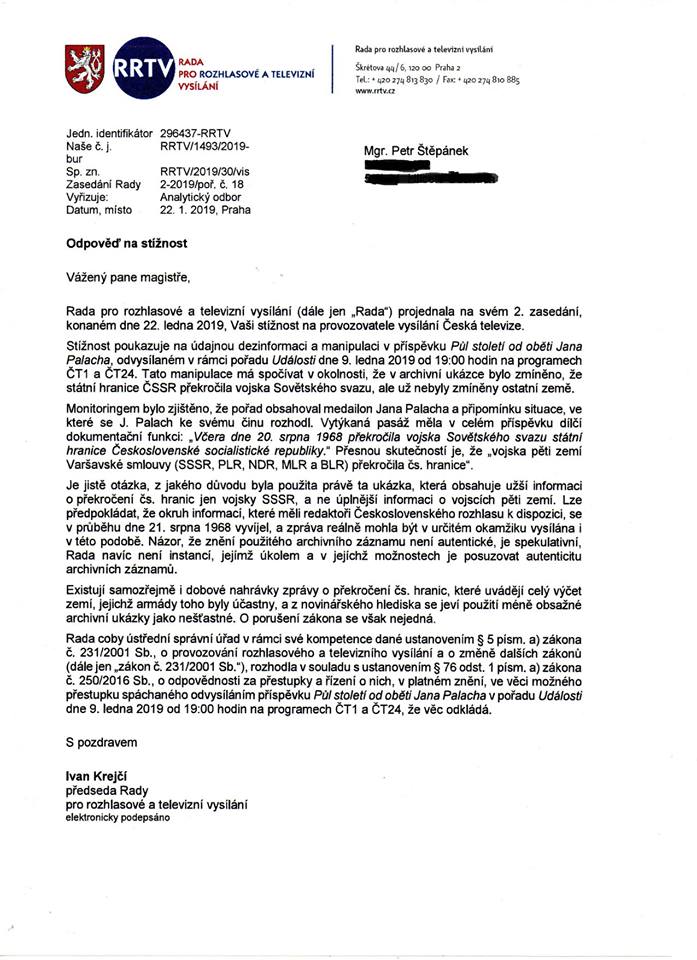 Hudebník a komentátor současného dění Petr Štěpánek na svém facebookovém profilu oznámil, že dostal odpověď Rady pro rozhlasové a televizní vysílání (RRTV) na jeho stížnost upozorňující na českotelevizní falšování dějin.