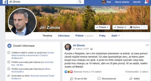 "Kundra z Respektu, ten s tím zbytečným písmenem ve jméně, už zase pomocí závisti rozjíždí emoce nenávisti," postěžoval si na svém facebookovém profilu Jiří Zimola.