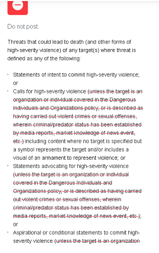 Otisk obrazovky původních pravidel a po „bouři konspiračních webů“ vyškrtnutých pravidel dokazující původně ohlášenou veřejnou a otevřenou podporu hlásání násilí proti osobám s nepohodlnými názory (to jen kdyby se facebooku nějak nešťastnou náhodou ztratila uvedená změna pravidel z historie...):