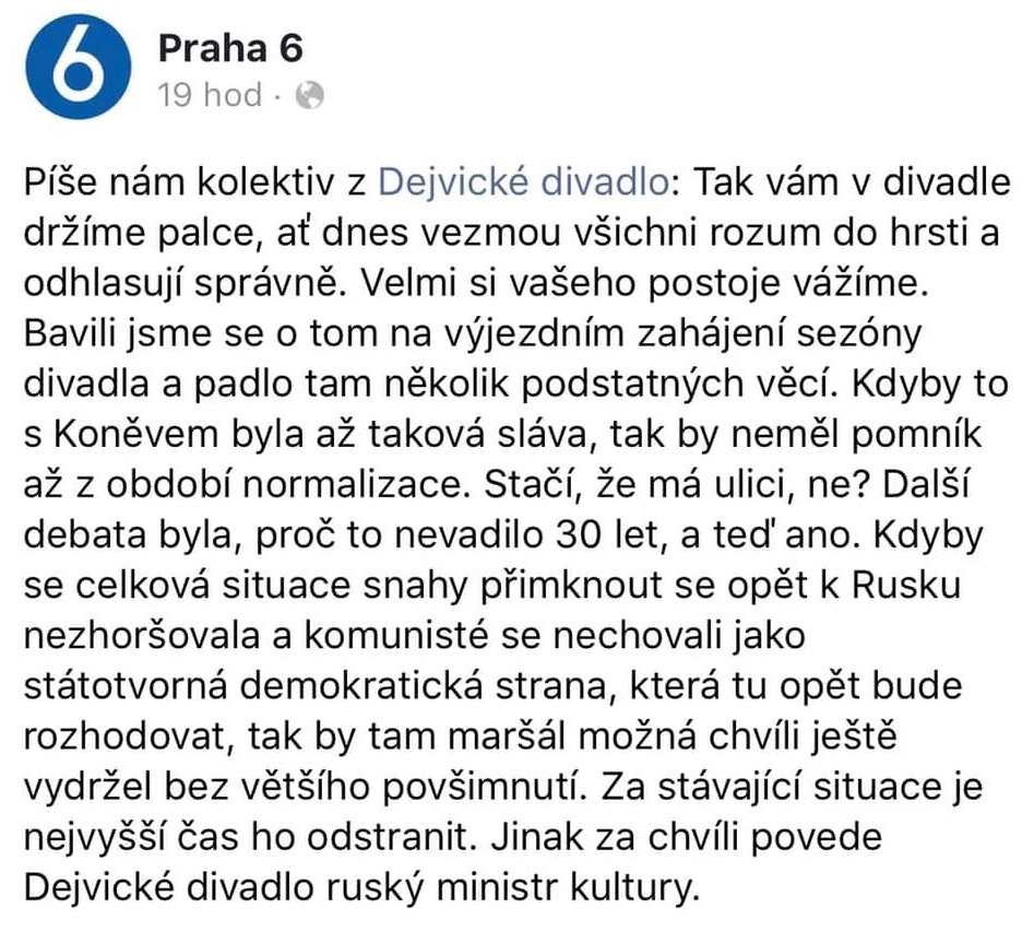 „Zaujala mne zpráva, že starosta Prahy 6 na jednání zastupitelstva a poté i městska část na sociální síti cituje "dopis kolektivu" (jednoho pražskeho divadla) žádajíci odstraněni Koněva (sochy)," komentoval na svém facebookovém profilu bývalý hejtman Michal Hašek, aby ještě dodal.
