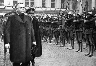 (Na snímku: slovenský katolický farář Josef Tiso - prezident Slovenského štátu - přehlíží jednotku "Rychlé divize" před odjezdem na frontu.)