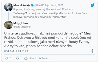 Na to mu Kolaja poněkud nešikovně zkusil oponovat následující replikou: „Takže například kraj Vysočina by měl podle Vás také mít možnost blokovat rozhodnutí v národním Parlamentu?“ To už tukana dostalo poněkud do varu a Kolajovo kulhající přirovnání označil za čirou demagogii. „Mezi Prahou, Ostravou a Jihlavou není kulturní a společenskej rozdíl, nebo ne takovej jako mezi různými kouty Evropy. Ale vy to víte, jenom ze sebe děláte blbečka,“ dodal.