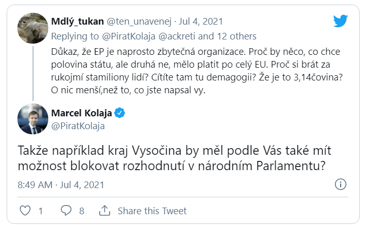 Uživatel s přezdívkou Mdlý tukan se pokusil pirátskému europolitikovi oponovat. Přijde mu podivné, že by se suverénní státy nechaly takto zotročovat. „Důkaz, že EP je naprosto zbytečná organizace. Proč by něco, co chce polovina států, ale druhá ne, mělo platit po celou EU. Proč si brát za rukojmí stamiliony lidí? Cítíte tam tu demagogii? Že je to 3,14čovina? O nic menší, než to, co jste napsal vy.“