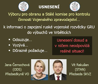 Nyní neřešíme, zdali se Rusové skutečně zapojili do výbuchů ve Vrběticích, nýbrž fakta*, která měli 20. dubna poslanci jakožto členové VO a SKVZ k dispozici. Tato fakta se ani po více než třech měsících nezměnila, což zvýrazňuje onu omezenost dotyčných poslanců. Mentální či češtěji duševní omezeností poslanců míníme jejich nízkou rozumovou schopnost rozpoznat a odlišit zřetelná fakta od ještě zřetelnější zpravodajské fabulace*. Poslanci přešli především jeden hlavní a nesporný fakt prezentovaný Národní centrálou proti organizovanému zločinu (NCOZ), který zcela ignorovali a horlivě se pustili do neopodstatněného očerňování ruské vlády (neopodstatněný = chybí řádné odůvodnění společně s odpovídající činností orgánů činných v trestním řízení – v tomto případě NCOZ).